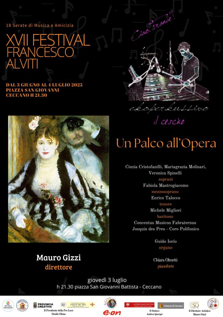 Giovedì 3 Luglio, Un palco all’opera: si va a teatro, al Festival Francesco Alviti con Di tanti palpiti, una serata dedicata al melodramma. Traviata, Norma, Rigoletto, Elisir d’amore, Trovatore, Nabucco, Turandot, Tosca le romanze e i cori del grande melodramma, arte italiana per eccellenza, risuoneranno nella splendida ambientazione di Piazza S. Giovanni per la penultima serata del Festival che vede ogni giorno decine e decine di musicisti impegnati a ricordare il loro amico Francesco nei luoghi che l’hanno visto crescere. E l’opera lirica svolge il suo ruolo fondamentale di interprete: Di tanti palpiti è affidato alle voci soliste di Cinzia Cristofanilli, Mariagrazia Molinari e Veronica Spinelli, soprani, Fabiola Mastrogiacomo, mezzosoprano, Enrico Talocco, tenore, e Michele Migliori, baritono, accompagnati da Chiara Olmetti al pianoforte e da Guido Iorio all’organo, e al coro del Concentus Musicus fabraternus Josquin Des Pres. La direzione è affidata a Mauro Gizzi