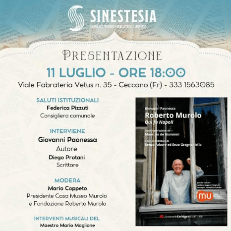 Si terrà venerdì 11 Luglio alle ore 18 a Ceccano nel caffè Letterario Sinestesia la presentazione del libro di Giovanni Paonessa “Roberto Murolo qui fu Napoli” edito da Armando De Nigris editore con la prefazione di Maurizio de Giovanni e con i contributi speciali si Renzo Arbore ed Enzo Gragnaniello.
