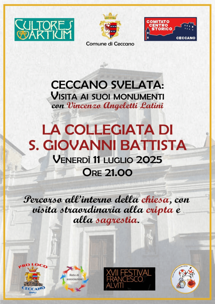 La chiesa madre di Ceccano, la sua cripta e i suoi tesori: sarà possibile visitarla venerdì 11 luglio alle ore 21, con la guida dell’arch. Vincenzo Angeletti Latini, per iniziativa dell’Associazione Cultores Artium e del Comitato per il Centro Storico, con la collaborazione della Proloco di Ceccano e della Rete delle Associazioni. S. Giovanni Battista è l’antica “chiesa madre” di Ceccano, con una storia millenaria e travagliata, caratterizzata da tre grandi restauri avvenuti nei secoli, che ne hanno stravolto le forme originarie medievali. Durante la serata ci sarà la visita straordinaria della Sagrestia – dove ci sono gli affreschi medievali – e della Cripta, dove si conservano resti romani e le antiche mura poligonali volsche. La visita è gratuita.