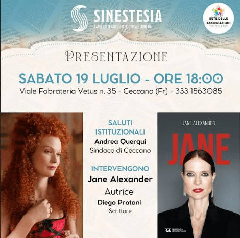 Evento di alto livello organizzato dalla rete delle Associazioni di Ceccano. Jane Alexander, la celebre interprete Elisa di Rivombrosa, presenterà sabato 19 Luglio alle ore 18 da Sinestesia il suo libro Jane.