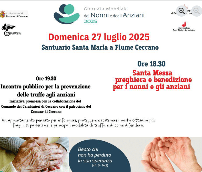 Troppe truffe contro le persone più deboli: per questo el istituzioni scendono in campo per creare una maggiore consapevolezza culturale che possa impedire il ripetersi di inganni da parte di persone senza scrupoli. L’incontro ci sarà a Santa Maria a fiume, domenica alle 19,30, cogliendo l’occasione offerta dalla Giornata dei Nonni e degli Anziani. L’iniziativa gode del patrocinio dell’amministrazione comunale e del comando dei carabinieri.