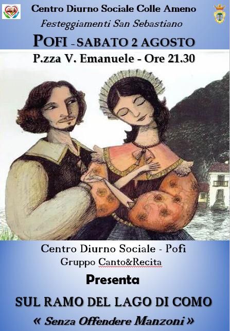 Sul ramo del lago di Como è il titolo della rivisitazione in canto de I Promessi Sposi di Alessandro Manzoni. Speriamo che non si offenda, dicono gli attori del Centro Diurno Sociale Centro Ameno di Pofi, che hanno curato l’arrangiamento scenico del romanzo, arricchendolo di canzoni e tante altre soprese. L’appuntamento è per le 21,30 di sabato 2 agosto, in Piazza Vittorio Emanuele, che a Pofi chiamano il Piazzone.