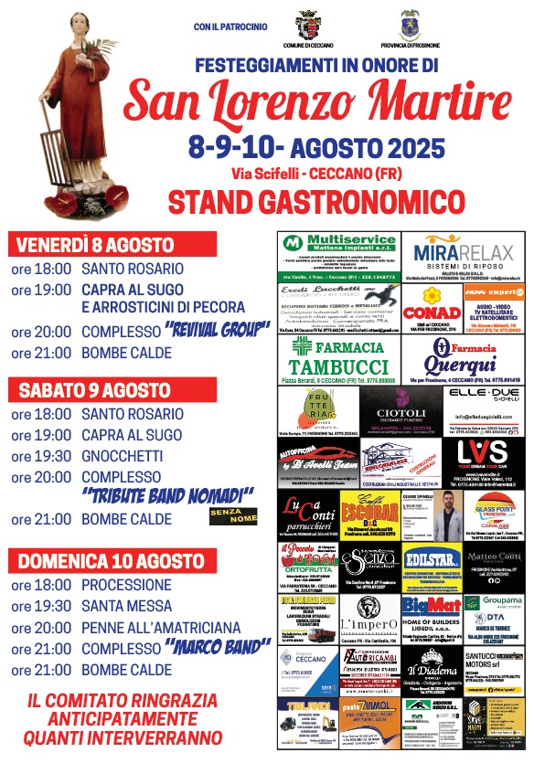Inizieranno venerdì 8 agosto i festeggiamenti per San Lorenzo, nella contrada Colle Leo a Ceccano, con tre serate di devozione, festa e gastronomia.