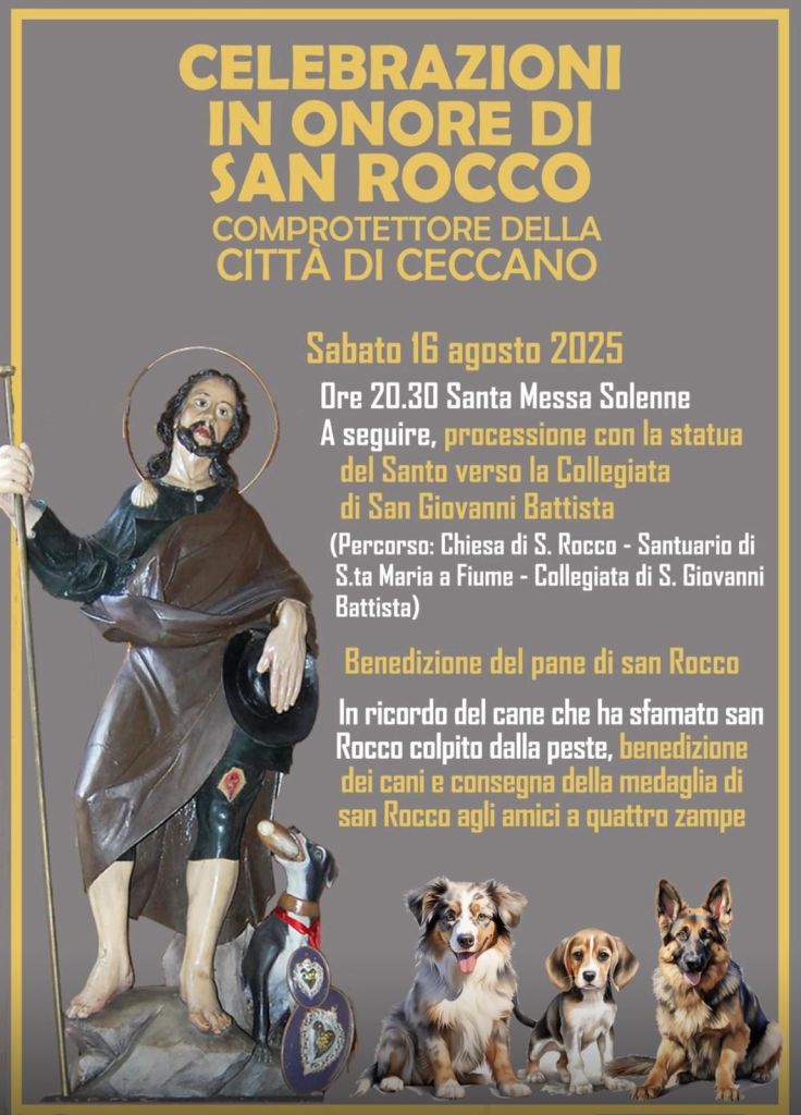 Dopo la folta partecipazione dello scorso anno, anche per il 2025 la processione di S. Rocco si svolgerà, a Ceccano, nelle ore serali. Alle 20,30 ci sarà la celebrazione della messa e poi l’avvio della processione, dalla chiesetta della Madonna di Loreto, lungo la via per Frosinone. La processione si concluderà nella Collegiata di S. Giovanni Battista. Ci sarà anche la benedizione dei cani e la consegna delle medagliette di S. Rocco.