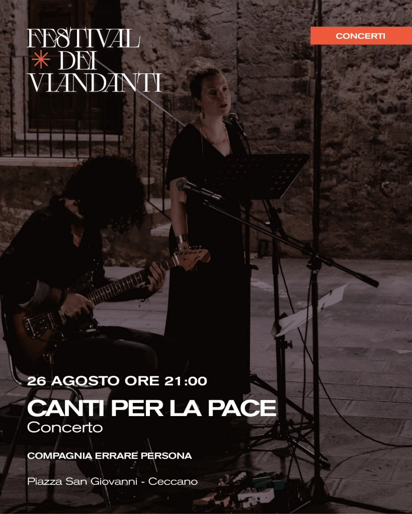 Martedì 26 agosto, alle 21, in Piazza San Giovanni a Ceccano, la Compagnia Errare Persona presenterà Canti per la pace, un concerto spettacolo, che delinea un viaggio nel Mediterraneo attraverso i suoi canti sacri, con brani ebraici, sefarditi, libanesi, palestinesi e della tradizione italiana, con letture tratte dall’Antico Testamento e dal diario di Etty Hillesum. Drammaturgia, regia e interpretazione sono di Damiana Leone, alla chitarra: Michele Bucciarelli, alla Fisarmonica: Robertino Carisi. Il Festival dei Viandanti coinvolge i comuni di Pofi, Ceccano, Arnara e San Giovanni Incarico.