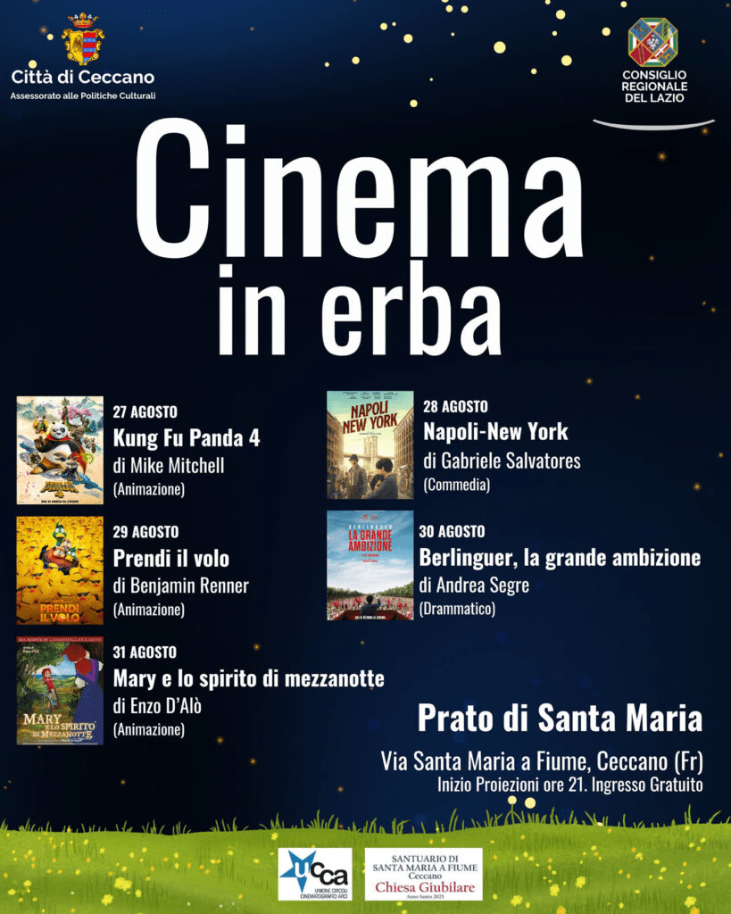 Dal 27 al 31 agosto, il cinema all’aperto gratuito nel cuore del Prato di Santa Maria a Fiume, luogo di incontro amato da tante generazioni di ceccanesi, come si legge nelle righe di presentazione dell’iniziativa. Cinema in erba intende appunto la proiezione sul prato del Santuario. 4 serate saranno dedicate ai bambini, con tre cartoni e il film di Gabriele Salvatores Napoli – New York, sull’emigrazione dei piccoli, e poi un film dedicato a Berlinguer.