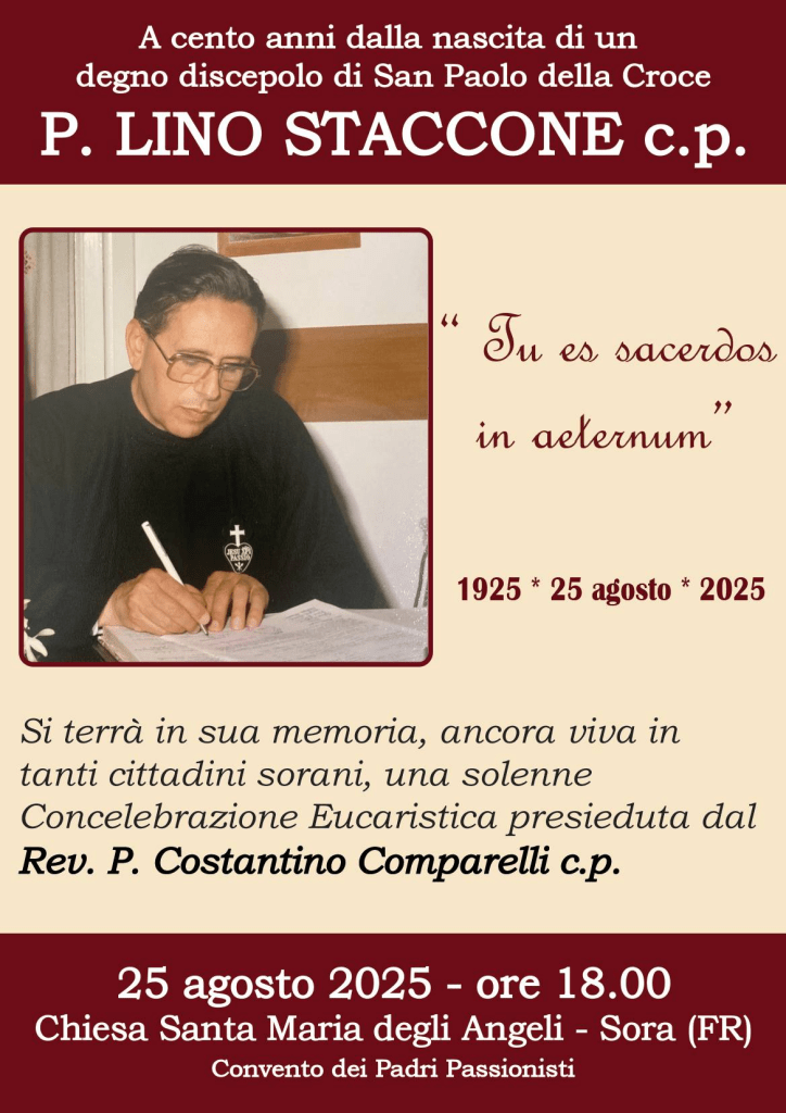 Una commemorazione molto sentita quella che si è svolta a Sora per ricordare p. Lino Staccone, passionista, nato a Ceccano, nel 1925. A Sora aveva esercitato il suo ministero, lasciando un grande ricordo che appunto si è concretizzato nella commemorazione che si è tenuta lunedi 25 agosto nella chiesa di S. Maria degli Angeli, alle ore 18, a cento anni dalla nascita. P. Lino, degno discepolo di S. paolo della Croce, era il quinto di 7 figli.