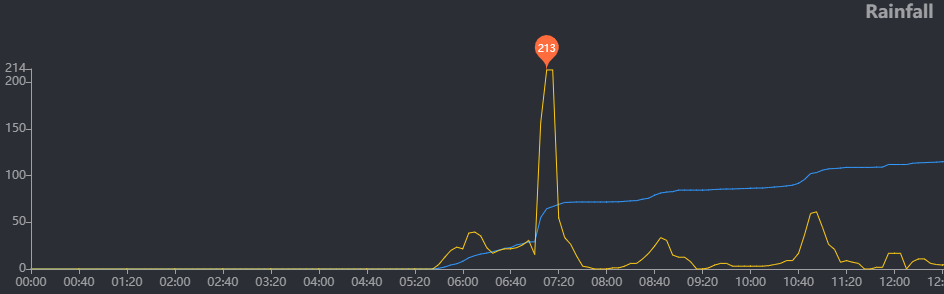 Una stazione meteo collocata sul territorio in zona Colle Antico a Ceccano mostra, nel grafico della mattina, un picco istantaneo di 213 mm/h attorno alle 7:10 e una media circa oraria di 65–70 mm (stimata dalla crescita della curva cumulata nell’intorno dell’evento).
