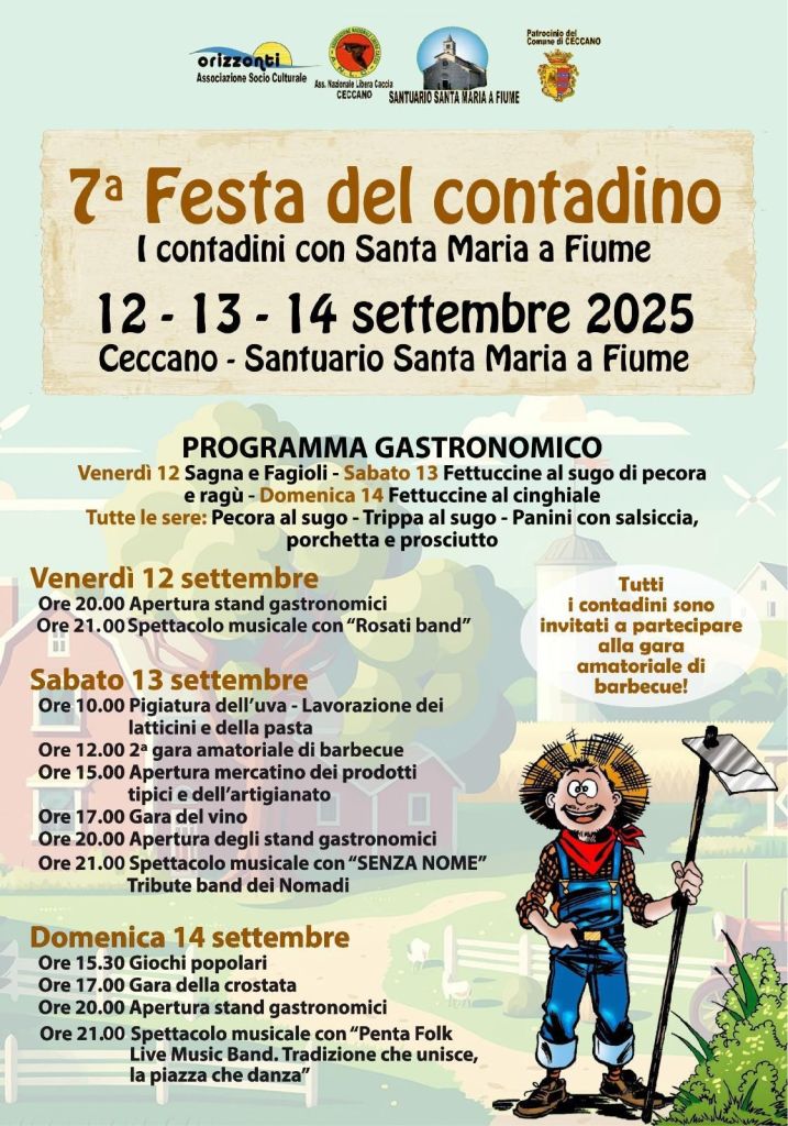 Tre giorni di festa a Ceccano, da venerdì 12 a domenica 14, in serata, per le tradizioni della campagna: è la Festa del Contadino, giunta alla VII edizione. Si svolgerà nel prato del Santuario di Santa Maria a fiume, con un programma di giochi popolari, di rievocazione di mestieri e tecniche contadine. Inizio alle ore 20. La festa è organizzata dall’Associazione Orizzonti, dall’Associazione Libera caccia, e dal Santuario, con il patrocinio del Comune di Ceccano.