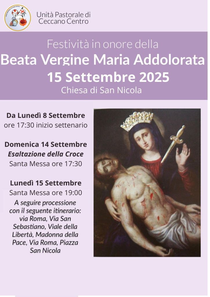 La Messa ci sarà alle ore 19 e poi uscirà la processione con il quadro che rappresenta la Vergine addolorata. La processione si avvierà per via Roma, scenderà in via S. Sebastiano, risalendo poi per viale della Libertà, via Madonna della pace e rientrerà in S. Nicola.