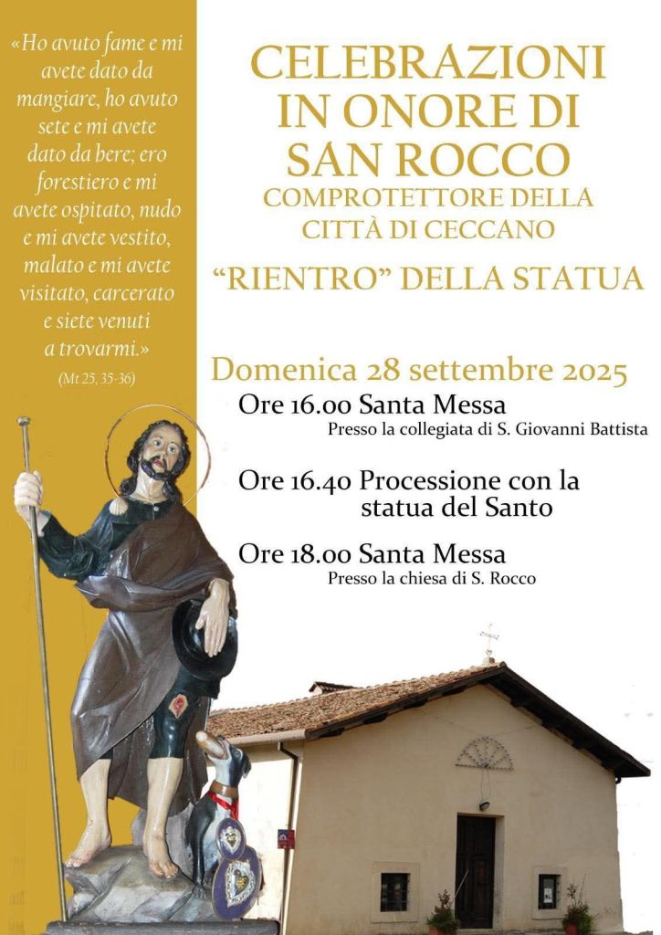 Come tradizione, la statua di S. Rocco tornerà oggi, domenica 28 settembre, nella chiesetta della Madonna di Loreto, in via per Frosinone. Alle ore 16 ci sarà la celebrazione a San Giovanni e poi la processione.