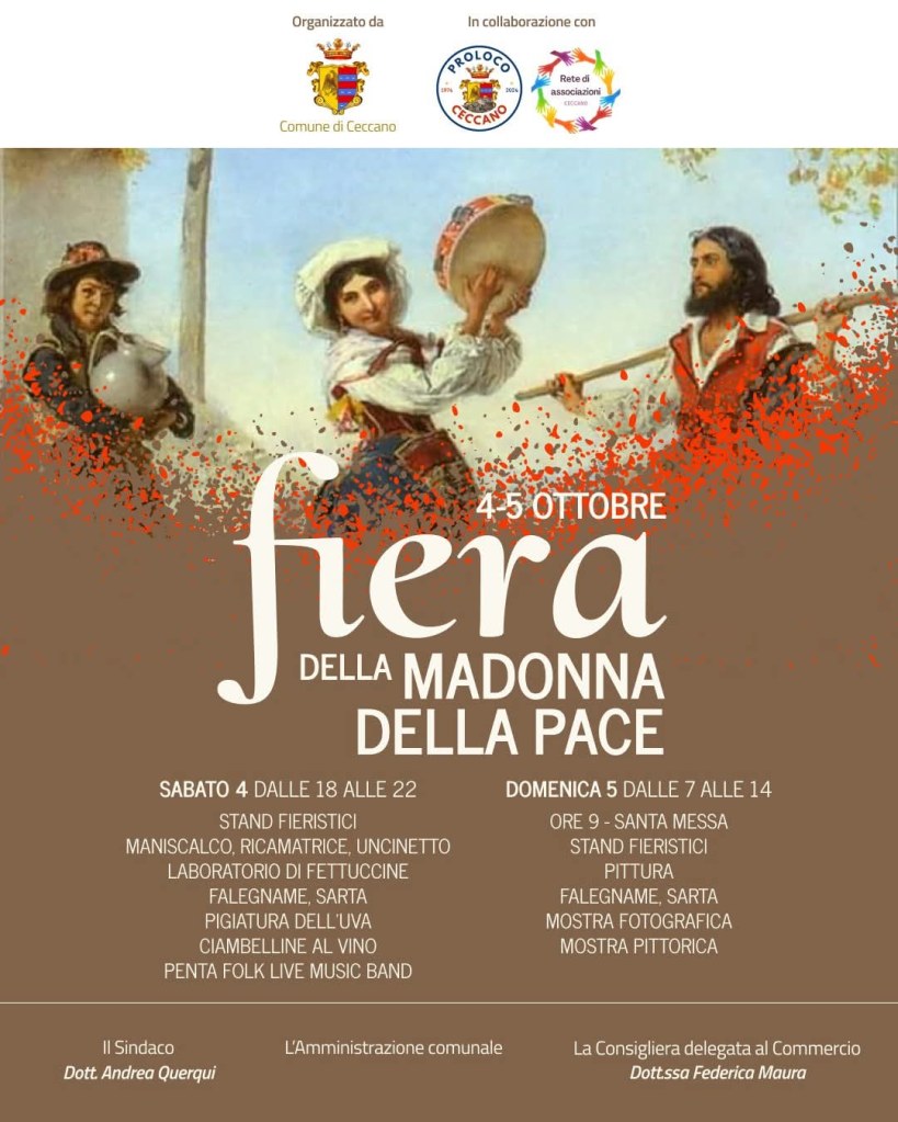 C’era una volta la mezza fiera della Madonna della pace, la sera precedente alla fiera vera e propria, che accompagnava la raccolta dell’uva, la prima domenica di ottobre. La mezza fiera era la festa degli abitanti del quartiere che si ritrovavano per quelle strade normalmente occupate dal traffico e dalle auto in sosta, mentre la fiera era un’occasione di incontro per tutti gli abitanti di Ceccano e dei centri viciniori. Anno dopo anno la tradizione si è illanguidita. Ora Palazzo Antonelli, in collaborazione con i residenti, la Proloco e la Rete delle Associazioni, ha preso l’impegno a farla ripartire, sabato 4 ottobre, con una serie di stand mangerecci ed altri che ricordano il tempo passato, con gli antichi mestieri, le tradizioni culinarie, la descrizione dei luoghi del quartiere, così come raccontati dagli anziani. Ci saranno un maniscalco, alcune ricamatrici, sarte, falegnami, vignaioli, pasticceri. E poi mostre di pittura e di fotografia. Il tutto rallegrato dalla musica dei Pentafolk, un gruppo di Castro dei Volsci, già molto apprezzato alla Festa del Contadino, all’inizio di settembre