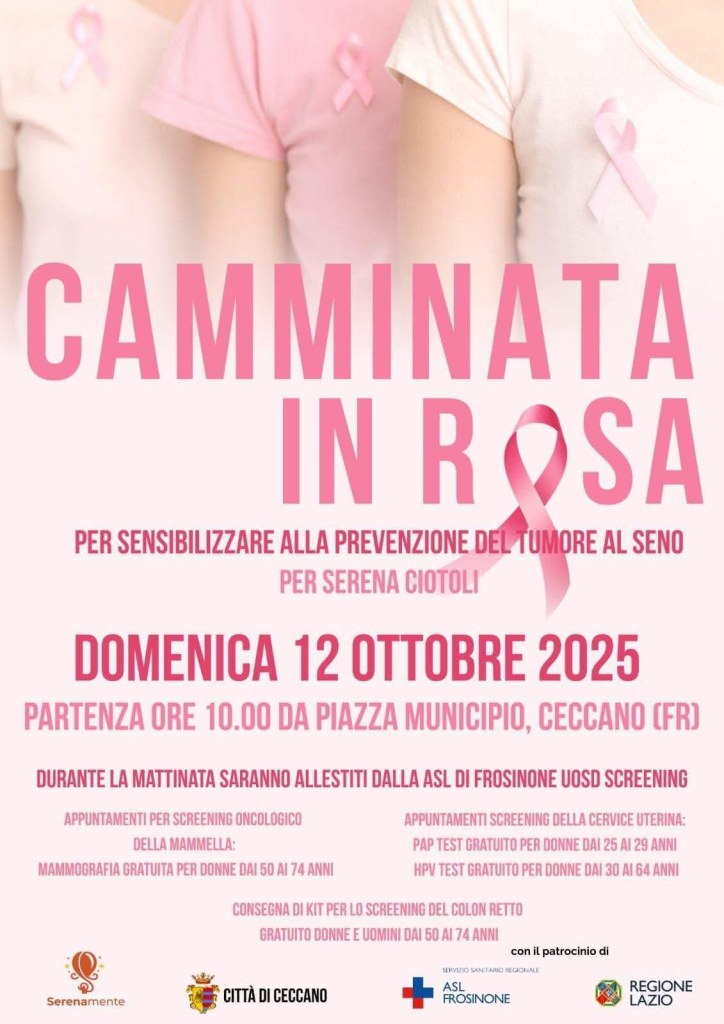 L’obiettivo della Camminata in rosa è quello di sensibilizzare alla prevenzione del tumore al seno, nel ricordo ancor vivo di Serena Ciotoli. Il raduno è previsto in Piazza Municipio, a Ceccano, domenica 12 ottobre, alle ore 10. Durante la mattinata ci sarà la possibilità di effettuare controlli per i tumori della mammella e della cervice uterina.