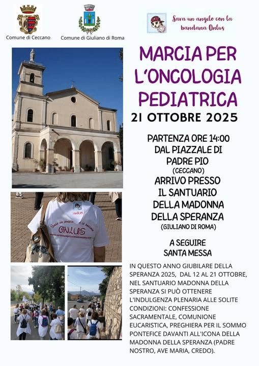 L’organizza l’Associazione Sara con la bandana che da tempo sostiene i reparti di oncologia pediatrica con tante azioni solidali. La marcia si tiene nel giorno della Festa della Madonna della Speranza, il santuario mariano di Giuliano di Roma. Il cammino avrà inizio da Piazzale Bachelet a Ceccano alle ore 14, per concludersi a Giuliano attorno alle 16,30.