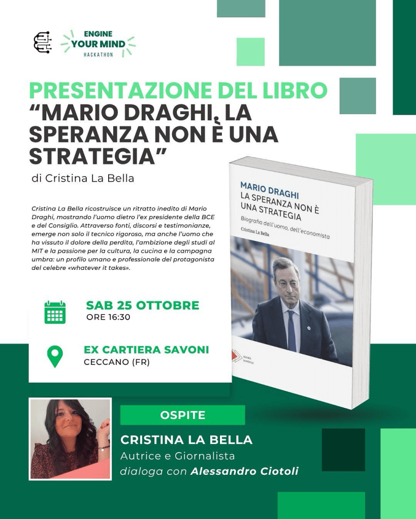 La speranza non è una strategia di Cristina La Bella è un viaggio intimo e sorprendente alla scoperta dell’uomo, colui che ha salvato l’euro e ridato speranza al nostro paese in un momento di crisi. Sarà presentato sabato 25 ottobre, alle 16,30, alla Mediateca di Ceccano dall’autrice e dall’assessore alla cultura di Ceccano, Alessandro Ciotoli. L’uscita del libro avviene in un periodo di grandi riflessioni sul futuro economico, politico e culturale dell’Italia e dell’Europa. Attraverso un lavoro di analisi e ricostruzione, scritto con rigore giornalistico e taglio letterario, Cristina La Bella ci racconta l’uomo dietro il potere, mettendo in luce le sue scelte, i dubbi e la solitudine del leader. L’obiettivo è andare oltre l’immagine pubblica del tecnico per svelare il lato umano di una figura che ha portato sulle spalle sfide gigantesche. L’autrice stessa ha spiegato che la sua curiosità nasce dalla necessità di comprendere perché Draghi sia stato chiamato, più volte, a “salvare” qualcosa: la Banca di Italia, l’Euro, il nostro Paese. Il libro rivela aspetti poco noti della sua vita, dall’infanzia segnata dalla prematura morte dei genitori agli studi al MIT e la brillante carriera. La narrazione include le sue battaglie più silenziose e i compromessi necessari, e si compone di quaranta capitoli, ciascuno aperto da una frase dell’ex numero uno della BCE. È un invito a riflettere sul peso dell’etica individuale nelle decisioni collettive e sull’importanza della competenza. La biografia rappresenta un tributo non retorico all’uomo e un atto d’amore all’Europa. Il volume, pensato per chi intende capire meglio le sfide che attendono l’Italia (e l’Europa), non si apre con una prefazione formale, ma con una riflessione personale dell’autrice.