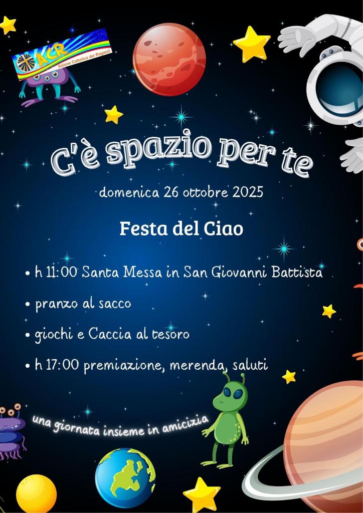Si svolgerà domenica 26 ottobre la Festa del Ciao che segna l’inizio dell’itinerario annuale dei bambini e dei ragazzi dell’ACR. Si svolgerà in Piazza S. Giovanni e in Piazza Municipio, dalle 11 alle 18, con giochi, caccia al teso, pranzo insieme, per una giornata insieme di amicizia. La partecipazione è aperta a tutti i bambini. Appunto: C’è spazio per tutti!