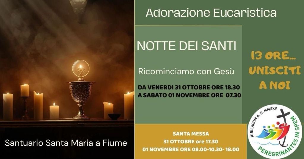 Si comincerà alle 18,30 di venerdì 31 ottobre e l’adorazione eucaristica proseguirà fino alle 7 del mattino seguente, al Santuario mariano lungo il fiume Sacco, chiesa giubilare, per la Solennità di tutti i Santi. Ricominceremo con Gesù è il tema della notte di silenzio, luce e preghiera. Un tempo per stare davanti al Signore, per ascoltare, per ritrovare pace, come si legge nell’invito diffuso dai responsabili del Santuario.