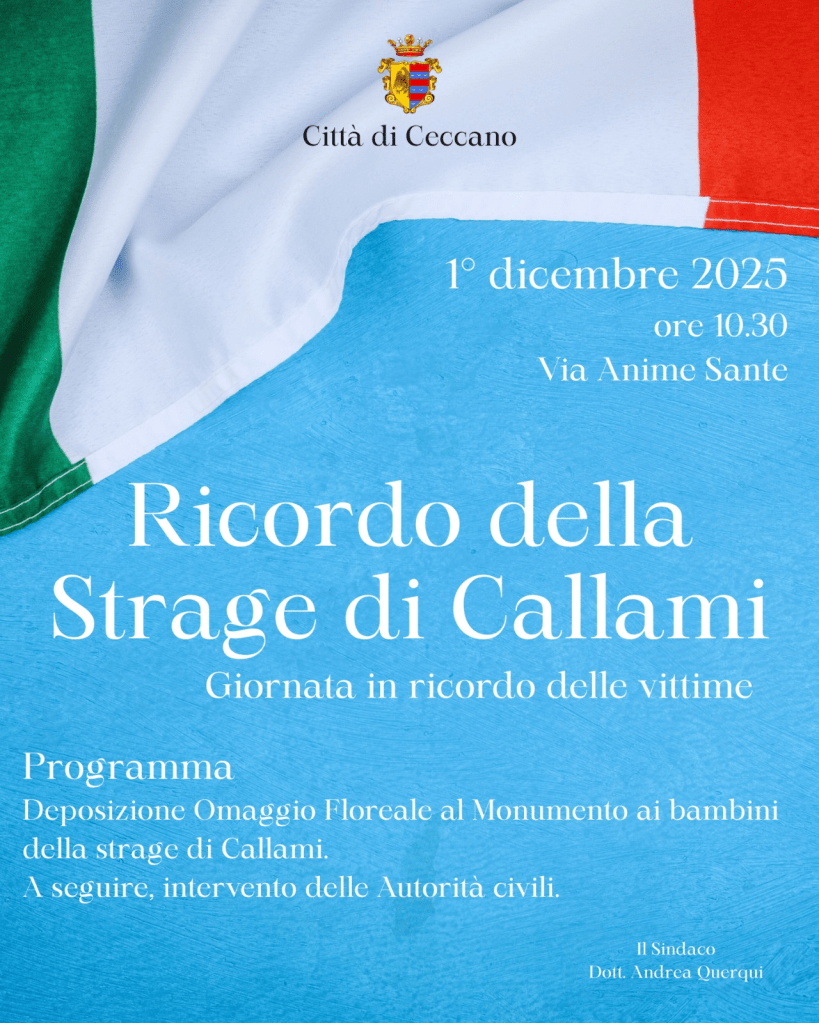 Una bomba residuata di guerra li uccise, a Ceccano, in via Anime Sante, mentre tornavano a casa: era il 1° settembre 1951, la guerra era passata da 7 anni, ma aveva lasciato i suoi strumenti di morte ad aspettare Francesca Cristofanilli, Domenico Mastrogiacomo, Vincenzo e Giuseppe Di Pofi, Giuseppe Ciotoli che tornavano a casa nei pressi della Botte. Lì, proprio nel luogo dell’esplosione, dopo decenni di oblio, per iniziativa dei contradaioli di Callami, guidati da Salvatore Masi, con l’aiuto della Pro Loco e della rete delle Associazioni, hanno realizzato un monumento che sarà inaugurato lunedì I° dicembre, alle ore 11.00. L’Amministrazione comunale deporrà un omaggio floreale al Monumento dei bambini di Callami, ricordando i cinque piccoli rimasti uccisi nel 1951 dall’esplosione di un residuato bellico. Interverranno il Sindaco Andrea Querqui, la Pro Loco, lo storico Angelino Loffredi e un rappresentante dell’Associazione Nazionale Vittime Civili di Guerra.