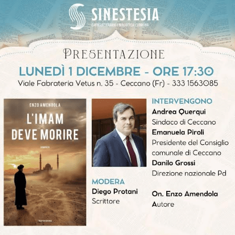 1978. L’Italia è scossa dagli anni di piombo e dal sequestro Moro, quando un’altra scomparsa intorbidisce acque già nere. Musa al- Sadr, Imam leader degli sciiti libanesi, è svanito insieme al suo seguito e le sue ultime tracce sembrano condurre a Roma. Il capitano dei servizi segreti italiani Roberto Stancanelli riceve dai suoi superiori l’incarico di indagare. Sin dalle prime fasi dell’inchiesta, però, Stancanelli si convince che l’Imam nella capitale non ci è mai arrivato. Qualcuno lo ha fatto sparire prima, e forse per sempre… è il contesto in cui si sviluppa il libro L’Imam deve morire, di Enzo Amendola, edito da Mondadori, la cui presentazione si terrà lunedì 1 Dicembre alle ore 17.30 presso Sinestesia a Ceccano. Amendola oggi deputato del Partito Democratico è stato già ministro per gli affari europei del governo Conte , sottosegretario alla Presidenza del consiglio dei ministri con delega agli affari europei del Governo Draghi e sottosegretario anche con i governi Renzi e Gentiloni. Intrecciando verità storica e finzione letteraria, Enzo Amendola mette in scena un grande intrigo internazionale, sulle orme dei classici del genere. Un romanzo che fa riemergere uno dei misteri più fitti dello scorso secolo – passato alla cronaca come il “caso Moro d’Oriente” – con il passo del thriller e la completezza del saggio. All’incontro parteciperanno anche il Sindaco Andrea Querqui, la Presidente del consiglio Piroli e Danilo Grossi della direzione nazionale del Pd. Modererà l’evento lo scrittore Diego Protani.