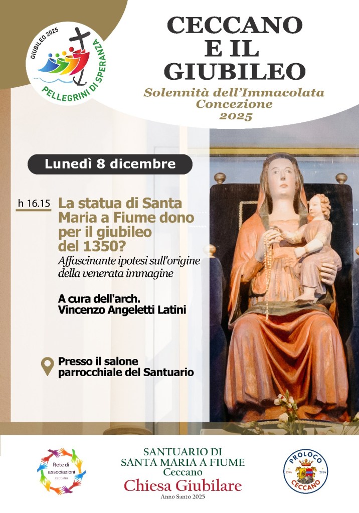 Da dove è arrivata quella statua? Perché proprio a Ceccano? Chi l’ha donata ai ceccanesi 7 secoli fa? A queste domande proverà a rispondere l’arch. Vincenzo Angeletti, lunedì 8 dicembre, alle ore 16,15, nel salone parrocchiale del santuario dedicato alla Vergine del fiume, sicuramente l’immagine sacra più venerata nella città. L’ipotesi dello studioso, che da qualche anno si è preso l’arduo compito di divulgare la storia di Ceccano e dei suoi beni culturali, senza ricorrere a misteri, ma rendendo noti appunto i documenti, è quello dell’esistenza di un legame giubilare tra la statua e Ceccano. Nel 1350 a Roma ci fu il secondo giubileo della storia, ma il papa, Clemente VI, era ad Avignone ed inviò come suo legato Annibaldo IV de Ceccano, cardinale segretario di Stato… il resto lo ascolteremo dall’arch. Angeletti.