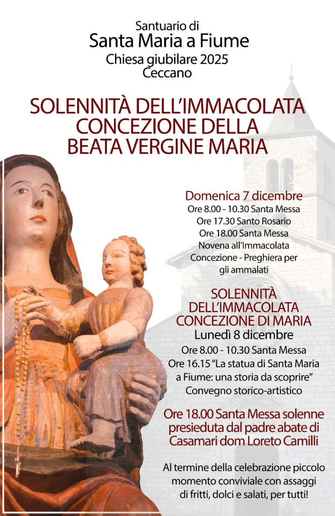 Sarà l’abate di Casamari, Loreto Camilli, a presiedere la celebrazione eucaristica nella chiesa giubilare di S. Maria a fiume a Ceccano lunedì 8 dicembre, alle ore 18, a conclusione della Solennità dell’Immacolata Concezione.
