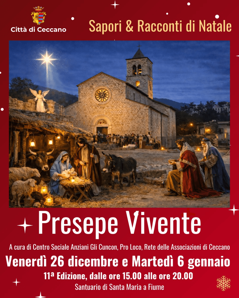 Tra gli appuntamenti più sentiti del Natale a Ceccano torna venerdì 26 dicembre il Presepe Vivente, giunto alla sua 11ª edizione, nell’inedita ma suggestiva cornice del Santuario di Santa Maria a Fiume. Un percorso fatto di scene, costumi e atmosfere che riportano al cuore della Natività, grazie all’impegno e alla partecipazione della comunità locale. La sacra rappresentazione sarà replicata il 6 gennaio, giorno dell’Epifania. La manifestazione è a cura del Centro Sociale Anziani “Gli Cuncon”, della Pro Loco e della Rete delle Associazioni di Ceccano. Un’occasione per riscoprire il significato più autentico del Natale, da vivere insieme, passo dopo passo, tra storia, fede e tradizione.