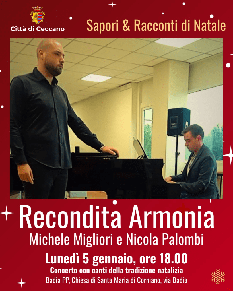 Sapori & Racconti di Natale a Ceccano si conclude nella suggestiva cornice della Badia dei Padri Passionisti, lunedì 5 gennaio, alle ore 18, con il concerto “Recondita Armonia”. Una serata di musica dedicata alle atmosfere più intime e spirituali del Natale, con un repertorio di brani natalizi e classici interpretati dal baritono Michele Migliori, accompagnato al pianoforte da Nicola Palombi, in un dialogo musicale capace di unire tecnica, emozione e raccoglimento.