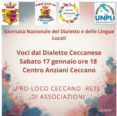 La Pro loco di Ceccano, insieme alla Rete delle Associazioni e con il patrocinio del Comune, celebra la Giornata nazionale del dialetto con una rassegna di poeti e di scrittori che presenteranno le loro creazioni al Centro Anziani, sabato 17 gennaio, alle ore 18. La Giornata è stata istituita dall’Unione Nazionale delle Pro Loco (Unpli) nel 2013 con il preciso intento di sensibilizzare istituzioni e comunità locali alla tutela e valorizzazione di questi patrimoni culturali; un’attività promossa per valorizzare dialetti e lingue locali. All’evento di Ceccano si sono iscritti già tanti poeti, sarà una serata divertente e in grado di tener viva una tradizione che andrebbe ancor più curata.