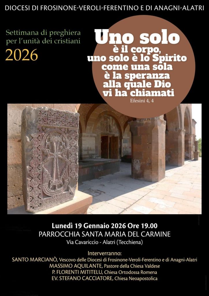 Insieme all’arcivescovo Mons. Marcianò, vescovo di Frosinone e Anagni Alatri, ci saranno il pastore Massimo Aquilante, della Chiesa Valdese, padre Florenti Mititelu, della Chiesa Ortodossa Rumena e Stefano Cacciatore, della Chiesa Neoapostolica, che pregheranno insieme per la Settimana per l’Unità dei Cristiani, che si svolge ogni anno dal 18 al 25 gennaio. L’appuntamento a Tecchiena di Alatri, nella Chiesa della Madonna del Carmine, è per lunedì 19 gennaio, alle ore 19. Quest’anno, la preghiera sarà incentrata su un versetto della lettera agli Efesini, al cap. 4, 4: Uno solo è il corpo, uno solo è lo Spirito, come una sola è la speranza alla quale Dio ci ha chiamati. Gli interventi sono affidati al pastore Aquilante e all’arcivescovo Marcianò.