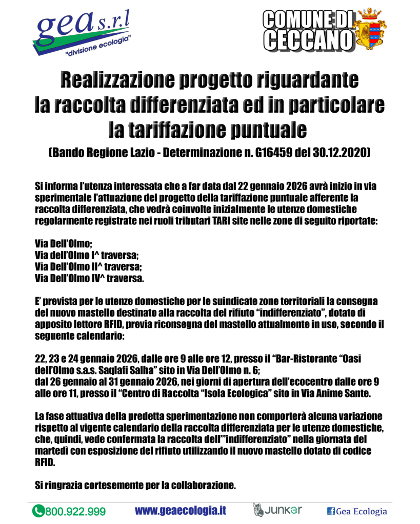 Riguarderà soltanto via dell’Olmo la sperimentazione della tariffazione puntuale nella raccolta differenziata dei rifiuti. Nulla cambia nel calendario ma i residenti di quella strada dovranno ritirane un nuovo mastello destinato alla raccolta del rifiuto indifferenziato. Il mastello sarà consegnato alle famiglie interessate dal 22 al 24 gennaio, dalle 9 alle 12, presso il Bar dell’Olmo, altrimenti bisognerà poi andare a prenderlo all’Isola Ecologica sulla Morolense, secondo gli orari di apertura.