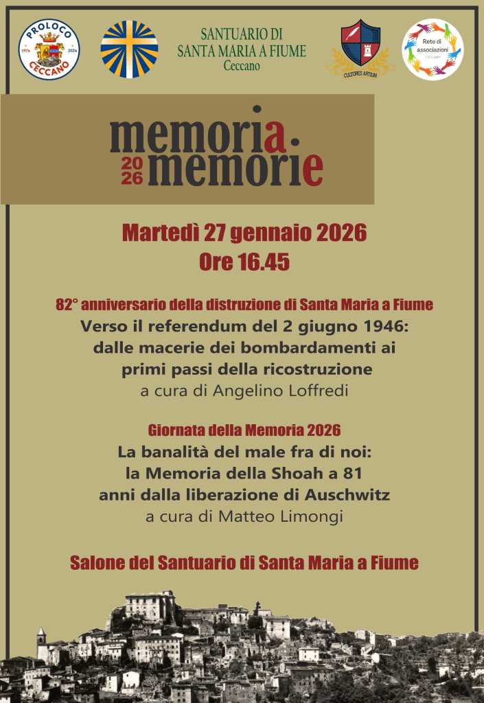 Il 27 gennaio del 1945, 81 anni fa, alle ore 11,54, le truppe sovietiche entravano nel Lager di Auschwitz, rivelando al mondo l’orrore di quanto era accaduto. Di fronte a quei cancelli e alle milioni di vittime che si sono drammaticamente spente al loro interno, tutti sono chiamati ad inchinarsi profondamente, nell’intimo, davanti alla innumerevole schiera di coloro che hanno sofferto e sono stati messi a morte per un meschino desiderio di potenza; ci viene chiesto un atteggiamento di silenzio ma anche di attiva partecipazione. La Giornata della Memoria non ha come compito quello della commiserazione delle vittime, non chiede un atteggiamento compassionevole: la Shoah è un’enorme questione politica e antropologica. Politica, perché pone il problema di come un popolo civilizzato abbia scientemente deciso di eliminarne un altro. Antropologica, perché rappresenta una cesura, una rottura nella civiltà occidentale. Per queste ragioni, la Rete delle Associazioni coordinata dalla Proloco di Ceccano, su iniziativa dell’Azione Cattolica, associazione territoriale Tommaso Bartoli, e dell’Associazione Cultores Artium, hanno organizzato, insieme al Santuario, un confronto storico in cui la memoria della Shoah aiuta a comprendere l’importanza del ricordo di quello che è accaduto nella nostra città. Interverranno Angelino Loffredi che traccerà un quadro della ricostruzione post bellica fino al dicembre del 1945, mentre Matteo Limongi affronterà il tema della banalità del male, per capire come anche nel nostro territorio ci siano state le nefaste conseguenze delle leggi razziali. Il dibattito avrà inizio alle 16,45 di martedì 27 gennaio, nel salone parrocchiale di S. Maria a fiume a Ceccano.