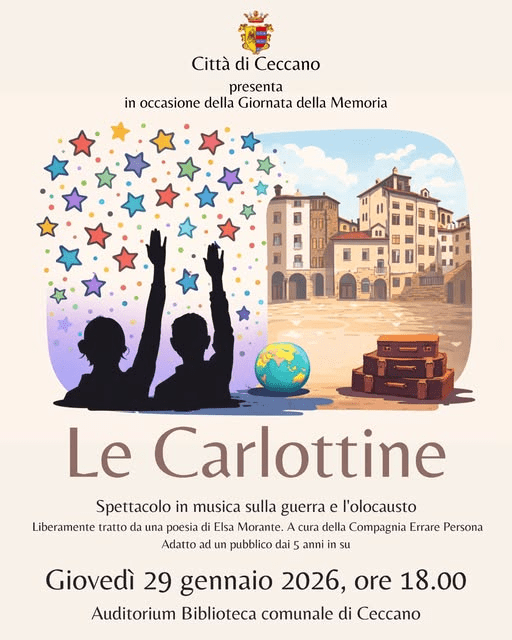 Per la Giornata della Memoria, giovedì 29 gennaio 2026, alle Ore 18.00, presso l’Auditorium Biblioteca Comunale di Ceccano il Comune di Ceccano presenta Le Carlottine, spettacolo in musica sulla Shoah, a cura della Compagnia Errare Persona, con adattamento e regia di Damiana Leone. Ispirato a un testo di Elsa Morante, lo spettacolo racconta la storia di Carlottina e della sua amica Carlotta attraverso lo sguardo puro e immaginifico dell’infanzia, rendendo accessibili anche ai più giovani temi complessi come la Shoah, la discriminazione e la memoria. Lo spettacolo è adatto dai 5 anni in su. Un appuntamento per riflettere insieme, con delicatezza, perché la memoria si costruisce fin da piccoli.