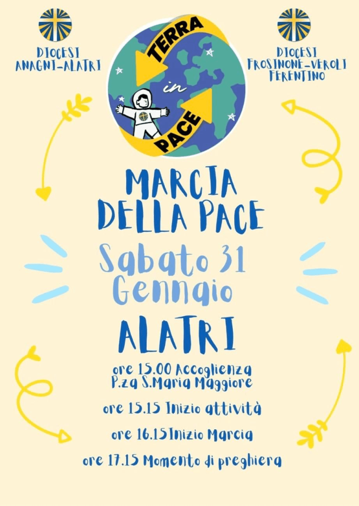 Si terrà ad Alatri la marcia della pace dell’azione Cattolica delle diocesi di Anagni Alatri e Frosinone. Con lo slogan Terra in pace, ragazzi, giovani ed adulti si ritroveranno alle ore 15, in Piazza Santa Maria Maggiore nella cittadina ernica