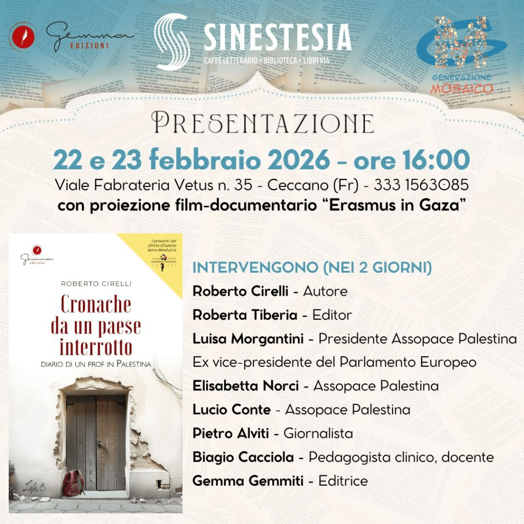 Domenica 22 e lunedì 23 febbraio alle ore 16:00, il Caffè Letterario Sinestesia di Ceccano si trasformerà in una finestra aperta su una realtà tanto vicina quanto complessa. Sarà presentato “Cronache da un paese interrotto”, l’opera di Roberto Cirelli che non è solo un libro, ma un diario civile e umano di rara intensità. Attraverso l’esperienza di Cirelli, docente di italiano all’Università di Birzeit tra il 2017 e il 2023, verrà esplorata la quotidianità di un popolo che vive in uno stato di perenne sospensione. Non si parlerà soltanto di geopolitica, ma di volti, di studenti che sfidano i checkpoint per raggiungere un’aula, di vite spezzate come quella della giornalista Shireen Abu Akleh e di una resistenza che passa per la cultura e la parola. Il titolo, “un paese interrotto”, ci interroga profondamente: cosa resta della normalità quando l’occupazione entra nelle aule universitarie? Roberto ci restituisce una testimonianza oculare preziosa, un documentario scritto che documenta l’erosione del diritto allo studio e alla dignità, ma anche la forza incrollabile del Sumud, la resilienza palestinese. L’incontro sarà l’occasione per riflettere insieme, lontano dai filtri dei telegiornali, su una terra ferita ma vibrante. L’evento sostiene Assopace Palestina, a cui sono devoluti i proventi del libro, rendendo la partecipazione un gesto concreto di solidarietà.