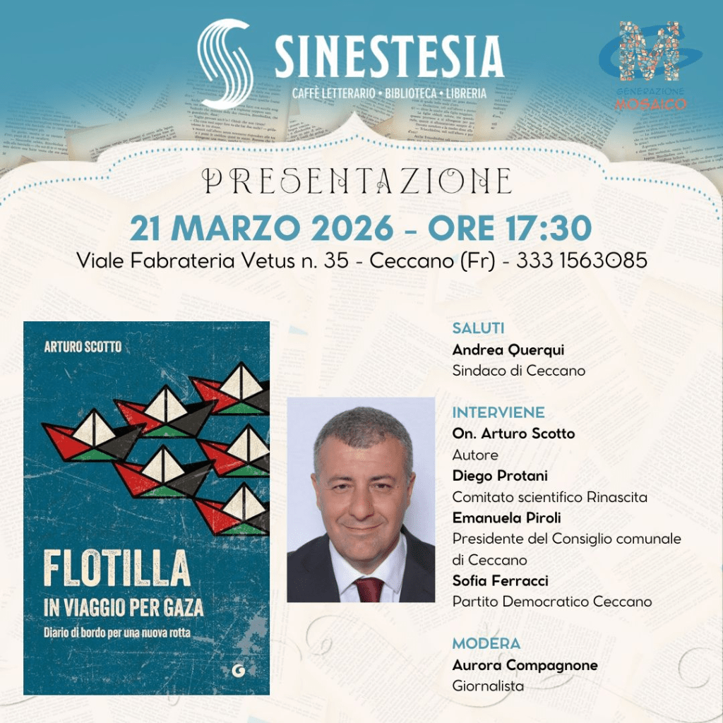 Si svolgerà sabato 21 marzo alle ore 17.30 a Ceccano presso il caffè letterario Sinestesia la presentazione del libro di Arturo Scotto “Flotilla in viaggio per Gaza” edito da Giunti. Un libro che parla a chi chiede giustizia, diritti e pace, fuori dai linguaggi tradizionali della politica. Perché una potenza militare come Israele ha paura di una quarantina di barche a vela che navigano pacificamente? Da questa domanda prende avvio Flotilla. In viaggio per Gaza, il libro in cui Arturo Scotto racconta la sua scelta di imbarcarsi sulla Karma, una delle navi della Global Sumud Flotilla partita da Genova per raggiungere la Striscia. Non una decisione facile: dubbi, tentennamenti, il peso delle responsabilità istituzionali. Ma anche la consapevolezza che, di fronte a un genocidio in diretta e all’inerzia della politica internazionale, fosse impossibile tirarsi indietro. Il libro è il racconto in prima persona dei giorni a bordo della Flotilla: l’attesa, la paura, la notte dei droni, l’abbordaggio dell’esercito israeliano, l’arresto, il sequestro dei telefoni, le 24 ore di detenzione. Ma anche i retroscena mai arrivati ai giornali, le omissioni dei media, il rapporto con il governo italiano, il dileggio politico, le conseguenze giudiziarie ancora in corso. Flotilla è però soprattutto una riflessione più ampia su ciò che questa missione ha rappresentato: un’esperienza capace di fare quello che alla politica tradizionale non riesce più, ovvero smuovere le coscienze, riempire le piazze, coinvolgere una generazione che spesso diserta le urne ma non rinuncia all’impegno. Un libro che intreccia testimonianza personale, etica e politica, e che prova a immaginare una nuova idea di partecipazione e di ordine mondiale. Arturo Scotto è deputato del Partito Democratico, capogruppo PD in Commissione Lavoro alla Camera e membro della Direzione nazionale del partito. Militante politico fin dall’adolescenza, è stato il deputato più giovane d’Italia nel 2006. Ha partecipato alla fondazione di Sinistra Ecologia e Libertà e di Articolo Uno, di cui è stato coordinatore nazionale. Presidente dell’associazione nazionale Compagno è il mondo, ha partecipato a numerose missioni umanitarie in Medio Oriente ed è una delle voci più riconoscibili del dibattito pubblico progressista italiano.