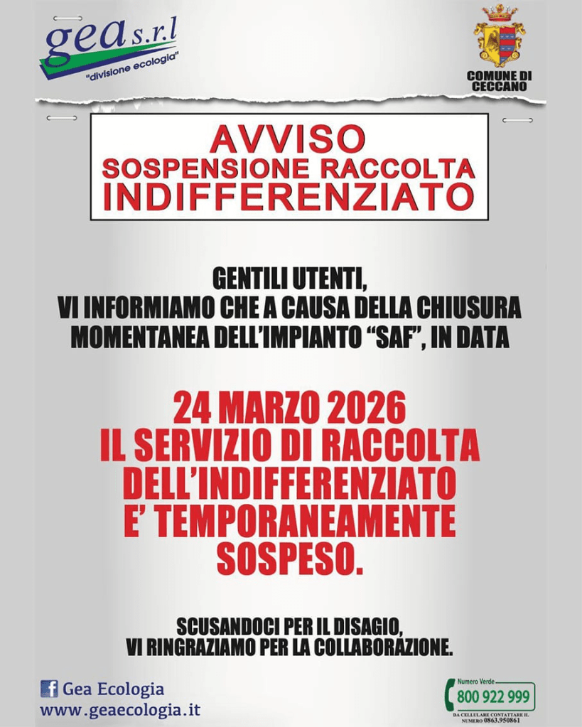 Non ci sarà la raccolta dell’indifferenziato martedì 24 marzo a Ceccano, come in tutti gli altri 90 comuni della provincia. La decisione è stata adottata a seguito di una comunicazione della società di gestione dell’impianto di Colfelice, dove vengono trattati i rifiuti indifferenziati del frusinate. Si resta in attesa di altre comunicazioni da parte di Palazzo Antonelli