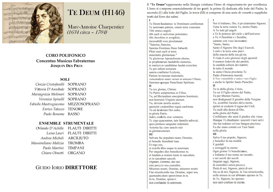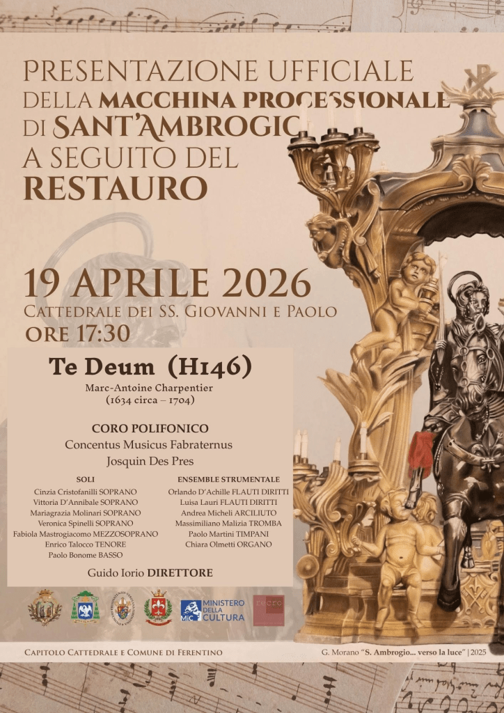 Saranno le note potenti del Te Deum di Marc Antoine Charpentier a salutare la conclusione del restauro che ha riguardato la macchina processionale di Sant’Ambrogio, patrono di Ferentino e della diocesi, domenica 19 aprile, nella Concattedrale dei santi Giovanni e Paolo, nella città gigliata. Ad interpretarlo il Concentus Musicus Fabraternus Josquin des Pres, con le voci soliste affidate ai soprani Vittoria D’Annibale, Cinzia Cristofanilli, Mariagrazia Molinari e Veronica Spinelli, al mezzosoprano Fabiola Mastrogiacomo, al tenore Enrico Talocco e al basso Paolo Bonomo. Saranno accompagnati da Luisa Lauri ed Orlando D’Achille ai flauti diritti, Andrea Micheli all’arciliuto, Massimiliano Malizia alla tromba barocca, Paolo Martini ai timpani e Chiara Olmetti all’organo e basso continuo. La direzione è affidata a Guido Iorio. L’appuntamento è per le 17,30 di domenica 19 aprile 2026
