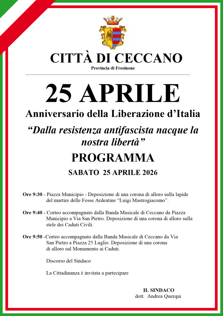 Inizieranno in Piazza Municipio alle ore 9,30, le celebrazioni per l’anniversario della Liberazione a Ceccano, sabato 25 aprile. Il discorso del sindaco Querqui è previsto alle 9,50