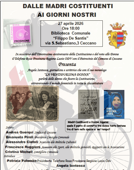 Le donne che fecero la Costituzione saranno al centro del convegno che si terrà lunedì 27 aprile, alle ore 18, nell’auditorium della Biblioteca Filippo Maria De Sanctis, a cura del Telefono Rosa, con il patrocinio del comune di Ceccano. Interverrà Angela Iantosca, che presenterà il monologo La Ventiduesima donna.